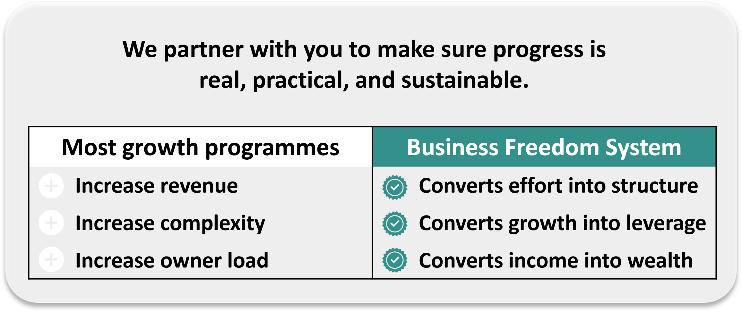 The Business Freedom programme helps owners move from doing the business to owning it; installing the structures, leadership, and systems that allow performance to scale without increasing reliance on the founder.